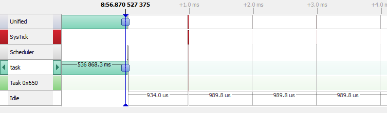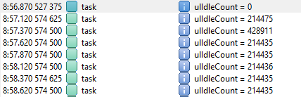 The timeline shows the task execution when it prints the variable with a 0 value. After, in the timeline, the execution of the IDLE task is waiting for the Ready state of the task., each tick Idle task is executed.