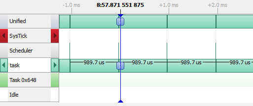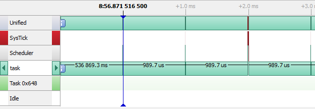 Task vTask is executed, observe that the first message is sent to terminal at the beginning of timeline.
