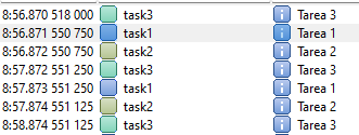 Three tasks is executing printing each of them a different message, Terminal shows that 3 messages are sent at the same time and repeat after 1 second.