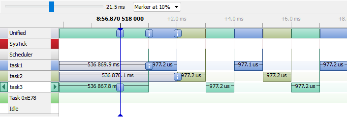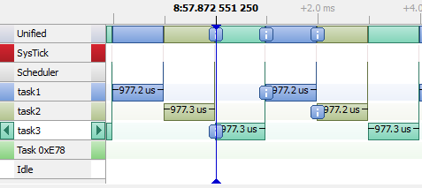 Time line shows that task3 is executed first and after Task1 and task2, each task uses the same function and therefore has the same delay. The messages are sent at the same time. |