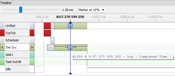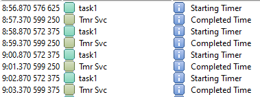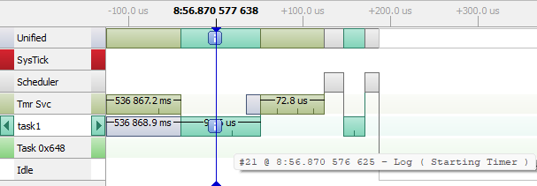 Timeline shows the execution of task1 to start the Timer count, task1 prints a message on terminal when the timer is started. |