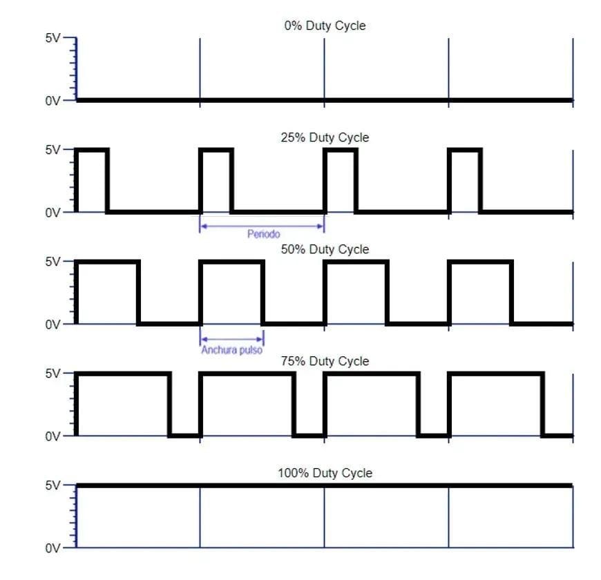 The term "Duty Cycle" refers to the percentage of its period during which the signal is "on." Most of the time, the duty cycle is represented as a percentage, with 0% being a completely off signal and 100% being a completely on signal.