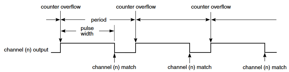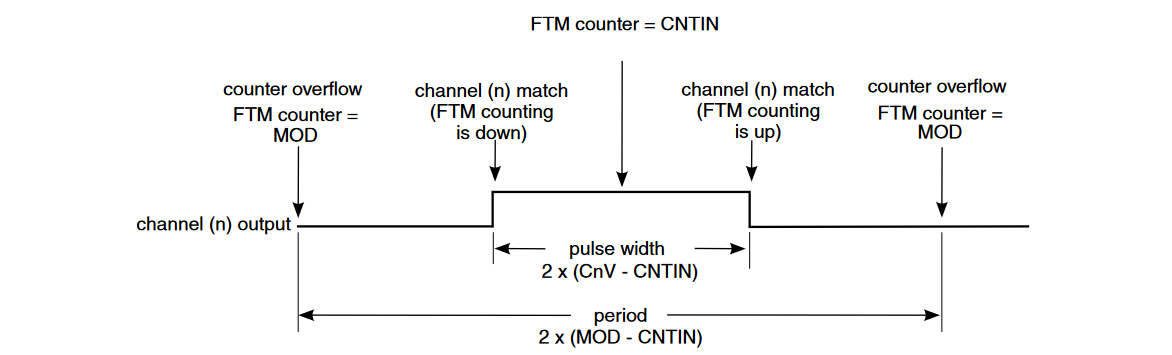 In this PWM generation mode, the first cycle of the signal starts with the counter at the value of zero or at overflow, and the polarity change occurs at the value set in the channel that will produce the PWM. Again, the polarity change occurs at the overflow of the base counter.