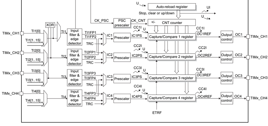 The microcontrollers in the STM32G0 family do not have an individual PWM module. PWM signals are generated using the TIM timers of the microcontroller along with their channels. While the frequency of the signal is generated by the timers' count, the duty cycle is set by the capture/compare modules of each channel. The number of PWM signals for each timer will depend on how many channels it has. All PWM signals from the same timer will share the same frequency.